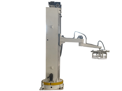 立柱机器人码垛机的运作流程是将包装好的物料通过输送机送至码垛制定区定位,立柱机器人通过各轴配合,将夹具运行至物料定位的正上方,当物料定位信号发出时,夹具通过伺服电机控制运动向下即Z轴向下运动,达到夹具夹持物料高度时,Z轴停止下降,夹具开启,夹起物料,Z轴伺服电机反转,将夹具升到安全高度后,通过客户预设程序将物料送至码垛位上方,Z轴下降,使物料到达放置点,此时夹具打开,将物料码入制定位置,重复以上动作,把整个托盘码垛完以后,报警提示,提醒已经码垛完成。人工叉车将码垛好的托盘运走,放入新的托盘,重新往复动作来完成批量生产码垛入库。