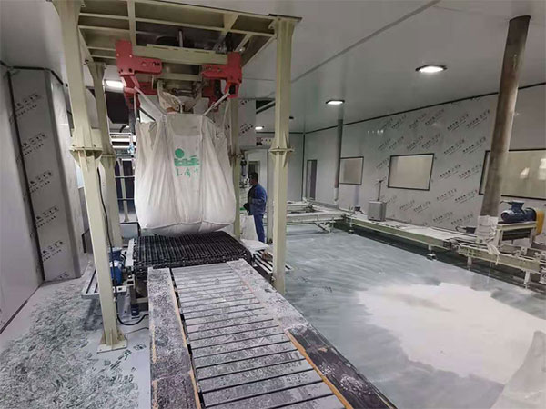 全自动吨袋包装机采用的包装袋为成卷包装袋,吨袋按照约80-120条/卷的规格卷成一卷,利用叉车将整卷包装袋放入袋框。设备运行时上袋输送机启动,同时袋卷转动,包装袋随输送机向前输送,当包装袋袋口到预定适位置时,检测传感器将包装袋到位信号传送到系统控制PLC,由PLC发出指令,袋口处上下吸盘将包装袋袋口吸住并拉开,上袋机械手将包装袋袋口撑开,将包装袋前移,灌装下料装置下降并伸入包装袋中,夹袋装置启动将包装袋口夹住提升。系统在确定夹袋成功后启动充气装置向袋内充气,随后称重系统将物料按照设定重力投入吨包装袋中,完成物料的灌装。灌装完成后,撑袋机构将包装袋袋口拉伸,热合封口机将袋口热封,辅助机构将袋口整理,调姿机构将包装袋系带提起并调整系带方向,利于后续码垛系统自动码垛。随后进入吨袋复检秤,当包装重量超出设定范围时系统会自动报警,重量符合要求吨袋会继续向前输送至待转运输送机位置。